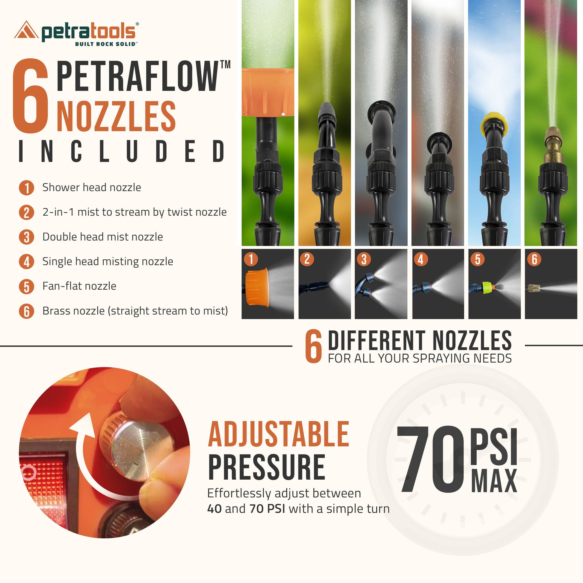 With the 8AH lead-acid battery, you’ll enjoy up to 8 hours of continuous spray capabilities. You’ll love the wide mouth opening for spill-proof pouring and the screen filter which keeps out dirt and debris. We include 5 nozzle attachments for applying a variety of solutions, a 70 PSI pump for adjustable spraying, and a high-pressure hose. The extendable wand includes a squeeze handle with locking mechanism. A translucent tank with gallon markings allows for easy mixing and instant knowledge of how much is left in the tank. The perfect way to spray!